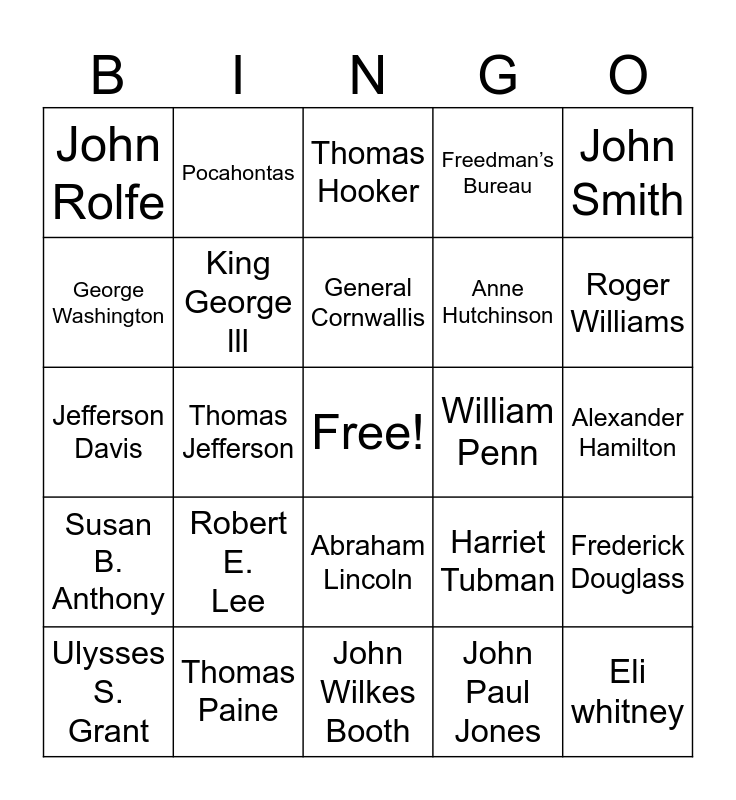 This bingo card has a free space and 24 words: Robert E. Lee, Thomas Paine, General Cornwallis, Ulysses S. Grant, John Smith, John Rolfe, George Washington, Pocahontas, William Penn, Abraham Lincoln, Anne Hutchinson, Jefferson Davis, Harriet Tubman, Frederick Douglass, King George lll, John Paul Jones, Alexander Hamilton, Thomas Hooker, Roger Williams, Thomas Jefferson, Eli whitney, Susan B. Anthony, Freedman’s Bureau and John Wilkes Booth.