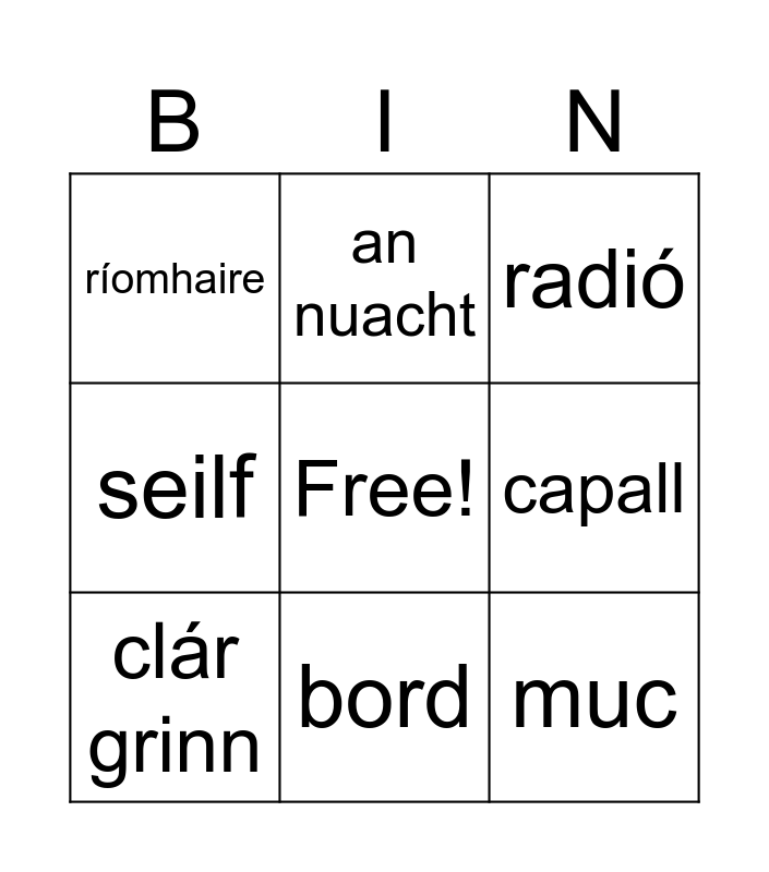 This bingo card has a free space and 21 words: Cartún, Scannán, an nuacht, clár spóirt, teilifís, clár grinn, ríomhaire, radió, ruga, bord, leabhar, seilf, cúisín, lampa, capall, asal, cat, madra, muc, leon and eilifint.