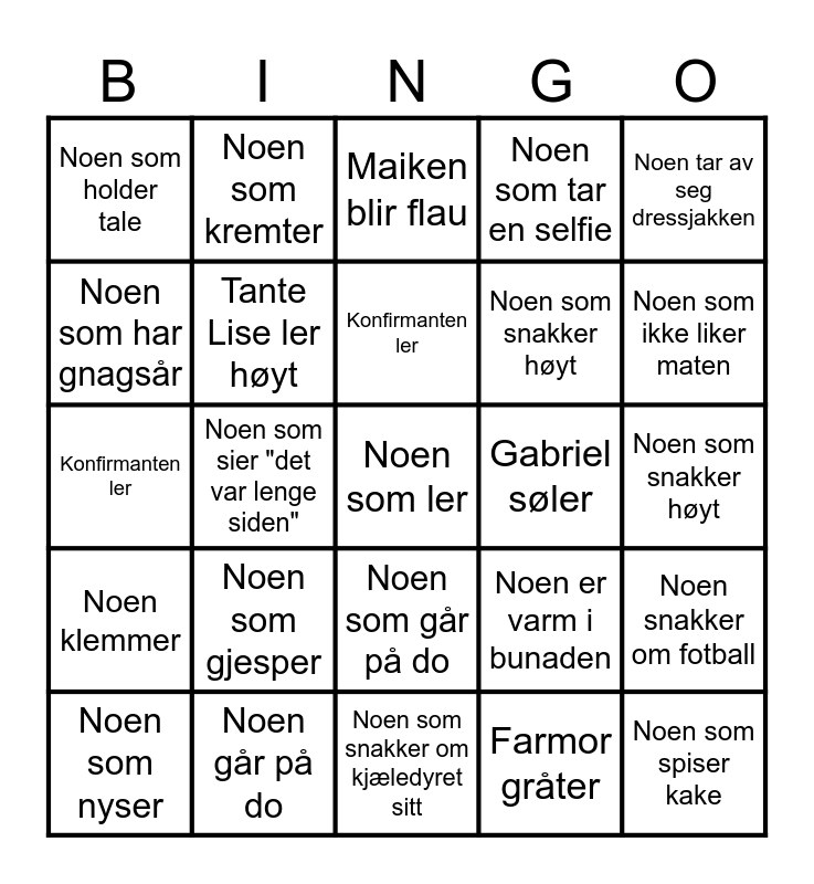 This bingo card has 60 words: Noen som klager på varm bunad, Noen går på do, Noen søler, Noen klemmer, Farmor gråter, Noen nyser, Tante Lise ler høyt, Onkel Svein søler, Noen som snakker høyt, Noen som har glemt noe, Noen som tar en selfie, Jøran snakker om vektløfting, Noen som har gnagsår, Noen som snakker om været, Gabriel gråter, Noen som holder tale, Noen som ler, Noen tar av seg dressjakken, Noen som sier "Det var lenge sia", Konfirmanten ler, Gabriel søler, Maiken blir flau, Noen som nyser, Noen snakker om fotball, Noen som snakker om Maddox, Bilde av en lettkledd konfirmant, Noen som nyser, Noen som rydder, Noen som ikke liker maten, Noen som skryter av maten, Noen som snakker om fotball, Noen gråter, Noen ler, Noen stresser, Noen som kremter, Noen som søler, Noen som tar en selfie, Noen som sier "det var lenge siden", Konfirmanten blir flau, Konfirmanten ler, Konfirmanten tørker tårer, Noen som gjesper, Noen som snakker høyt, Noen som ler, Noen er varm i bunaden, Noen som har glemt noe, Noen som har gnagsår, Noen som snakker om været, Noen som kremter, Noen som går på do, Noen som snakker om kjæledyret sitt, Jøran snakker om vektløfting, Noen som drikker gul brus, Noen som drikker vann, Noen som kysser, Noen som går i dress, Noen som tar av seg dressjakken, Noen som ikke har slips, Noen som spiser kake and Noen som spiser reker.