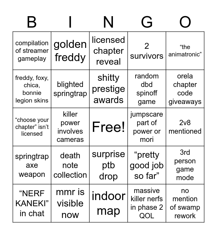 This bingo card has a free space and 24 words: death note collection, mmr is visible now, shitty prestige awards, “NERF KANEKI” in chat, “the animatronic”, compilation of streamer gameplay, freddy, foxy, chica, bonnie legion skins, golden freddy, jumpscare part of power or mori, surprise ptb drop, random dbd spinoff game, “choose your chapter” isn’t licensed, “pretty good job so far”, 3rd person game mode, blighted springtrap, massive killer nerfs in phase 2 QOL, 2v8 mentioned, licensed chapter reveal, orela chapter code giveaways, killer power involves cameras, no mention of swamp rework, springtrap axe weapon, 2 survivors and indoor map.