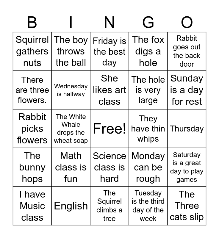 This bingo card has a free space and 24 words: Math class is fun, English, She likes art class, I have Music class, Rabbit goes out the back door, Squirrel gathers nuts, There are three flowers., The boy throws the ball, They have thin whips, Science class is hard, The hole is very large, Rabbit picks flowers, Monday can be rough, Saturday is a great day to play games, Wednesday is halfway, Tuesday is the third day of the week, Thursday, Friday is the best day, Sunday is a day for rest, The White Whale drops the wheat soap, The Three cats slip, The bunny hops, The fox digs a hole and The Squirrel climbs a tree.