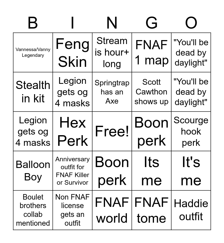 ⚠ This card has duplicate items: FNAF 3 map (2), Dredge Skin (2), Agony in perk name (2), Balloon Boy (2), Springtrap isn't the killer (2), Cyberpunk theme for CYOC (2), Legion gets og 4 masks (2), Scourge hook perk (2), 2 Survivors (2), FNAF world (2), Stealth in kit (2), FNAF tome (2), Boon perk (2), Springtrap has an Axe (2), FNAF 1 map (2), "You'll be dead by daylight" (2), Scott Cawthon shows up (2)