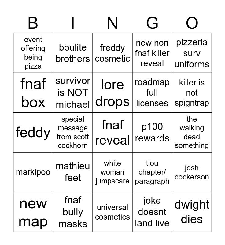This bingo card has a free space and 24 words: mathieu feet, fnaf bully masks, lore drops, new map, pizzeria surv uniforms, event offering being pizza, fnaf box, boulite brothers, p100 rewards, white woman jumpscare, roadmap full licenses, feddy, tlou chapter/ paragraph, josh cockerson, survivor is NOT michael, joke doesnt land live, the walking dead something, freddy cosmetic, killer is not spigntrap, special message from scott cockhorn, dwight dies, markipoo, new non fnaf killer reveal and universal cosmetics.