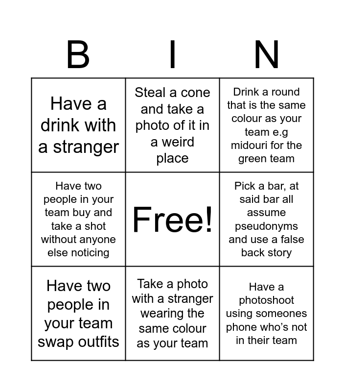 This bingo card has a free space and 8 words: Pick a bar, at said bar all assume pseudonyms and use a false back story, Drink a round that is the same colour as your team e.g midouri for the green team, Steal a cone and take a photo of it in a weird place, Have two people in your team swap outfits, Have a drink with a stranger, Have a photoshoot using someones phone who’s not in their team, Have two people in your team buy and take a shot without anyone else noticing and Take a photo with a stranger wearing the same colour as your team.