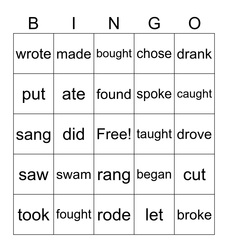 This bingo card has a free space and 33 words: was/were, had, did, went, saw, ate, drank, took, made, said, found, bought, brought, thought, taught, caught, fought, sang, swam, began, rang, drank, wrote, drove, rode, broke, chose, spoke, put, cut, hit, let and cost.