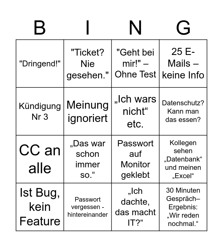 This bingo card has 16 words: Passwort vergessen - hintereinander, Kollegen sehen „Datenbank“ und meinen „Excel“, "Geht bei mir!" – Ohne Test, "Dringend!", CC an alle, "Ticket? Nie gesehen.", Passwort auf Monitor geklebt, „Ich dachte, das macht IT?“, Kündigung Nr 3, Meinung ignoriert, Ist Bug, kein Feature, 25 E-Mails – keine Info, „Das war schon immer so.“, Datenschutz? Kann man das essen?, „Ich wars nicht“ etc. and 30 Minuten Gespräch– Ergebnis: „Wir reden nochmal.“.