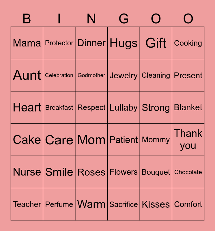 This bingo card has 55 words: Free!, Mom, Mother, Mama, Mommy, Grandma, Aunt, Stepmom, Godmother, Love, Hugs, Kisses, Flowers, Roses, Tulips, Bouquet, Gift, Present, Card, Heart, Breakfast, Chocolate, Cake, Dinner, Family, Celebration, Thank you, Appreciation, Respect, Care, Support, Sacrifice, Strength, Home, Cooking, Cleaning, Comfort, Lullaby, Nurse, Teacher, Protector, Cheerleader, Friend, Beautiful, Strong, Patient, Kind, Warm, Smile, Jewelry, Perfume, Spa, Relax, Blanket and Candle.