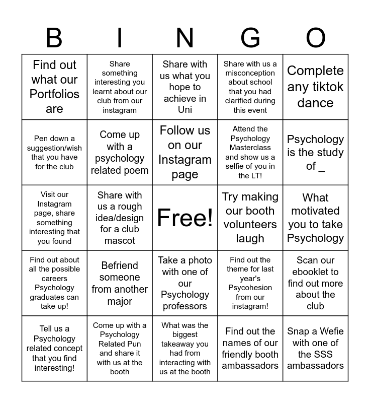 This bingo card has a free space and 24 words: Befriend someone from another major, Come up with a Psychology Related Pun and share it with us at the booth, Follow us on our Instagram page, Tell us a Psychology related concept that you find interesting!, Complete any tiktok dance, Find out what our Portfolios are, Pen down a suggestion/wish that you have for the club, Share something interesting you learnt about our club from our instagram, Try making our booth volunteers laugh, Take a photo with one of our Psychology professors, Attend the Psychology Masterclass and show us a selfie of you in the LT!, Visit our Instagram page, share something interesting that you found, Find out the theme for last year's Psycohesion from our instagram!, Scan our ebooklet to find out more about the club, Come up with a psychology related poem, Find out the names of our friendly booth ambassadors, What motivated you to take Psychology, Share with us what you hope to achieve in Uni, Psychology is the study of _, Share with us a rough idea/design for a club mascot, Snap a Wefie with one of the SSS ambassadors, Find out about all the possible careers Psychology graduates can take up!, Share with us a misconception about school that you had clarified during this event and What was the biggest takeaway you had from interacting with us at the booth.