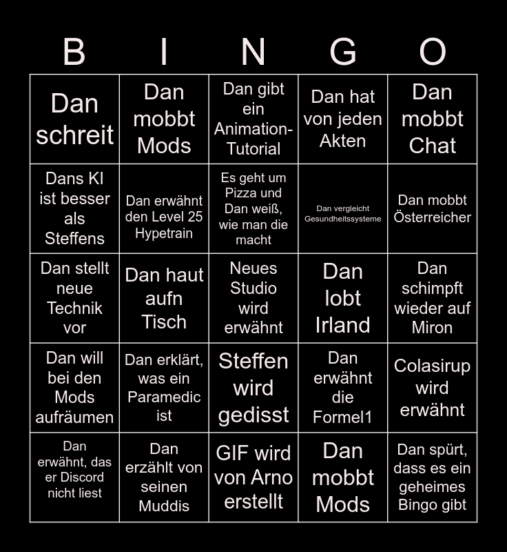 This bingo card has a free space and 24 words: Dan erklärt, was ein Paramedic ist, Dan erzählt von seinen Muddis, Es geht um Pizza und Dan weiß, wie man die macht, Dan erwähnt, das er Discord nicht liest, Dan mobbt Chat, Dan schreit, Dans KI ist besser als Steffens, Dan mobbt Mods, Dan lobt Irland, Steffen wird gedisst, Dan vergleicht Gesundheitssysteme, Dan stellt neue Technik vor, Dan erwähnt die Formel1, Colasirup wird erwähnt, Dan erwähnt den Level 25 Hypetrain, Dan mobbt Mods, Dan schimpft wieder auf Miron, Dan gibt ein Animation-Tutorial, Dan mobbt Österreicher, Dan haut aufn Tisch, Dan spürt, dass es ein geheimes Bingo gibt, Dan will bei den Mods aufräumen, Dan hat von jeden Akten and GIF wird von Arno erstellt.