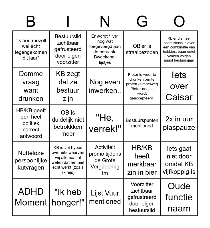This bingo card has 38 words: Spontane Beleidsplannen / iets noemen wat niet besproken is, "Nu even geen antwoord op!", Implementatiedetails, KB zegt dat ze bestuur zijn, Iets gaat niet door omdat KB vijfkoppig is, KB is vet hyped over iets waarvan wij allemaal al weten dat het niet echt werkt (zoals skireis), Nog even inwerken.., Er wordt gehint naar bestuurskleur of ander bestuursgeheim, KB’er die heel optimistisch is over een combinatie van hobbies, baan en/of vakken volgen naast bestuursjaar, Pieter is weer te dronken om te praten (simpelweg Pieter-oogjes wordt geaccepteerd), OB is duidelijk niet betrokkken meer, OB'er is straalbezopen, "He, verrek!", 2x in uur plaspauze, Domme vraag want drunken, Nutteloze persoonlijke kutvragen, Iemand wil perse een stift van de andere kant van de tafel hebben, Er wordt *live* nog wat toegevoegd aan de beruchte Bweekend-lijstjes, Er wordt heel vaak niet betaald voor de (Uit)HoCKI koelkast, Bestuurspunten mentioned, "Ik ben mezelf wel echt tegengekomen dit jaar", "Ik heb honger!", Iets over Caisar, ADHD Moment, "Hier gaat KB iets over vertellen", Lijst Vuur mentioned, Oude functie naam, Uni = kut, Thomas Klos/Johannes mention, "Apres-CKI, Apres-CKI, Apres-CKI..!", HB-KB hebben (impliciet) kritiek op elkaar, Activiteit promo tijdens de Grote Vergadering tm, Voorzitter zichtbaar gefrustreerd door eigen bestuurslid, Bestuurslid zichtbaar gefrusteerd door eigen voorzitter, Iemand begint over molens of molendag, HB/KB heeft merkbaar zin in bier, HB/KB geeft een heel politiek correct antwoord and Commentaar op de accommodatie.