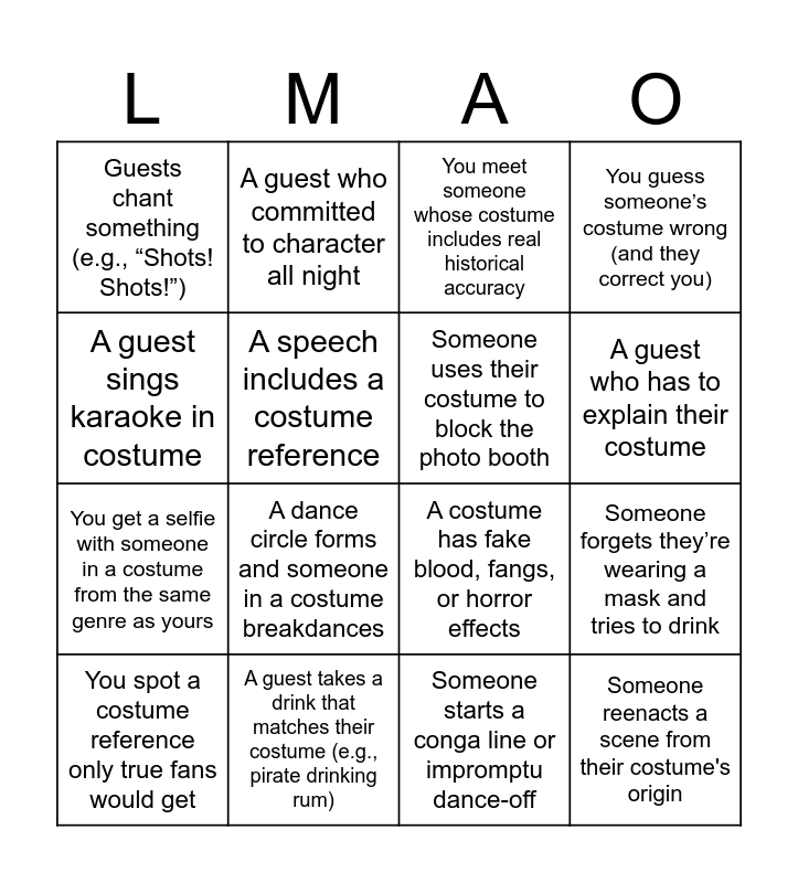 This bingo card has 65 words: Free!, Someone dressed as a Disney character, A guest in full body paint, A couple in matching costumes, Someone wearing wings, A DIY costume that’s actually impressive, A guest who committed to character all night, A costume with lights or electronics, A guest who has to explain their costume, A guest in a costume clearly bought last minute, Someone spills a drink while dancing, Group photo with 3+ costume themes, Someone starts a conga line or impromptu dance-off, A guest sings karaoke in costume, Someone dramatically enters the room in slow motion, A speech includes a costume reference, Someone forgets they’re wearing a mask and tries to drink, Guests chant something (e.g., “Shots! Shots!”), Someone makes a pun about their costume, You get a selfie with someone in a costume from the same genre as yours, A costume gets stuck in a doorway or chair, Someone reenacts a scene from their costume's origin, You guess someone’s costume wrong (and they correct you), Someone compliments your costume, You high five a superhero, You talk to someone you've never met before, Someone's costume malfunctions or falls apart, Someone changes costumes during the event, You spot a costume reference only true fans would get, Someone wins a costume contest, Someone in costume starts giving relationship advice, The couple kisses in costume, Someone’s costume includes stilts or extreme height, A guest’s costume has multiple pieces that keep falling off, Someone brought a themed accessory weapon (sword, blaster, wand, etc.), A costume includes a real musical instrument, Someone’s wearing body armor (real or fake), A costume has fake blood, fangs, or horror effects, A guest keeps adjusting a wig or headpiece, Someone keeps accidentally hitting people with their costume, Someone uses their costume to block the photo booth, A guest’s costume is clearly too hot to wear inside, A guest takes a drink that matches their costume (e.g., pirate drinking rum), Someone uses a fake accent, A toast includes a pun related to a costume, Someone references pop culture and it lands perfectly, A dance circle forms and someone in a costume breakdances, You overhear someone say “I should’ve gone with my second costume idea”, Someone makes a costume-related pickup line, Someone poses like an action figure or movie poster, A guest uses their costume to sneak food or drink, A costume includes a backpack that clearly has snacks inside, Someone quotes their costume character in conversation, A guest tries to explain their obscure costume and no one gets it, A stranger joins your group because of costume similarity, Someone asks where the bathroom is while totally in character, You get dragged into a TikTok or IG Reel in costume, You meet someone whose costume includes real historical accuracy, Someone uses a fan or cooling device mid-party, A spontaneous themed group dance (e.g., Thriller, Time Warp, etc.) happens, A guest uses a glow stick, LED, or laser in their outfit, A non-costumed person feels pressured and tries to improvise one, Someone wins an unofficial award for “most effort”, You overhear someone planning next year’s costume already and Someone says, “This is the best wedding I’ve ever been to”.