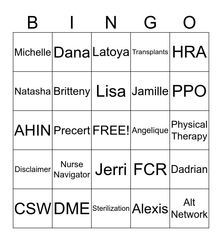 This bingo card has a free space and 39 words: Claims, Sherrie, OON, Britteny, CSW, Jerri, Lisa, Martha, HRA, Disclaimer, Precert, Transplants, Alt Network, Physical Therapy, Angelique, Nurse Navigator, Customer Service, Michelle, Mental Health, FCR, Natasha, Sterilization, Jamille, PPO, PCS, Birth Control, QA scorecard, COCC, Reference Number, Dana, Inpatient, Obesity, Latoya, DME, Alexis, Helen, Dadrian, AHIN and Pharmacy.