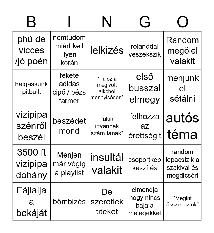 This bingo card has 25 words: Menjen már végig a playlist, De szeretlek titeket, *Túloz a megivott alkohol mennyiségen*, Fájlalja a bokáját, Random megölel valakit, phú de vicces /jó poén, halgassunk pitbullt, nemtudom miért kell ilyen korán, felhozza az érettségit, insultál valakit, első busszal elmegy, vizipipa szénről beszél, csoportkép készítés, random lepacsizik a szakival és megdicséri, fekete adidas cipő / bézs farmer, "Megint összehoztuk", autós téma, lelkizés, menjünk el sétálni, beszédet mond, "akik ittvannak számítanak", bömbizés, 3500 ft vizipipa dohány, rolanddal veszekszik and elmondja hogy nincs baja a melegekkel.