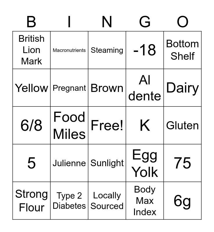This bingo card has a free space and 30 words: Strong Flour, Wheat, Brown, 5, Bottom Shelf, British Lion Mark, Macronutrients, Sunlight, K, 6g, 5, Pregnant, Anaemia, Body Max Index, 75, Herring, Salmon, Trout, Mackerel, Food Miles, Locally Sourced, Egg Yolk, Dairy, 6/8, Type 2 Diabetes, Steaming, Al dente, Gluten, Yellow, Julienne, Free - Range, -18 and Carbs.