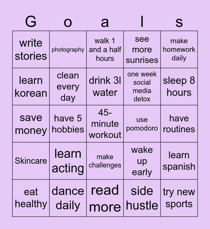 This bingo card has 25 words: Skincare, dance daily, 45-minute workout, side hustle, make homework daily, write stories, photography, walk 1 and a half hours, use pomodoro, learn spanish, learn korean, clean every day, read more, wake up early, sleep 8 hours, eat healthy, have 5 hobbies, drink 3l water, one week social media detox, have routines, save money, learn acting, make challenges, see more sunrises and try new sports.