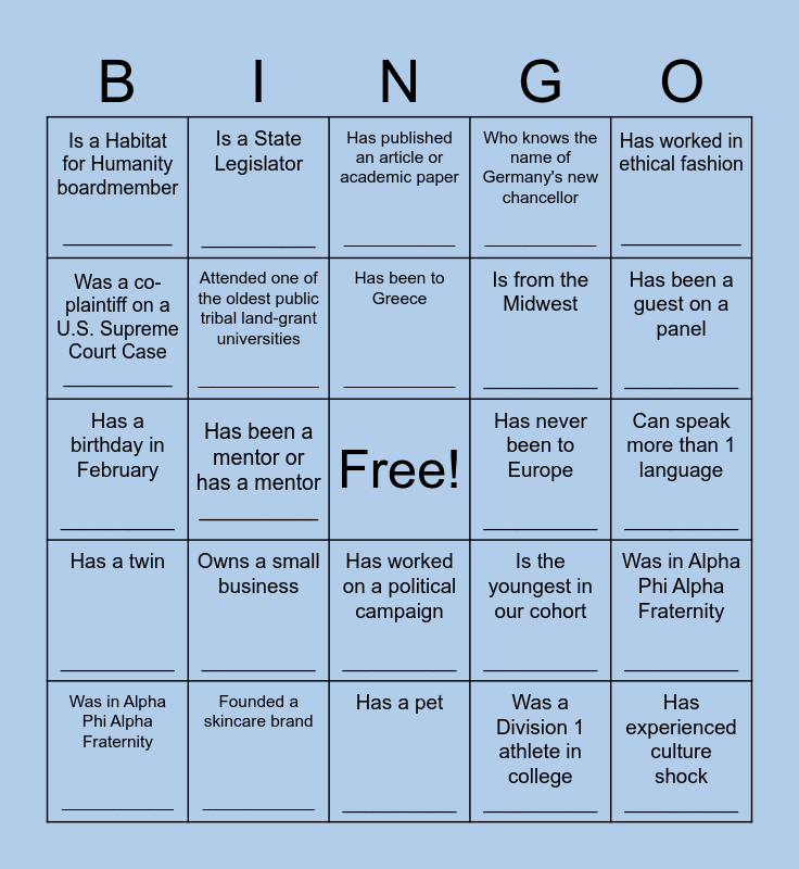 This bingo card has a free space and 24 words: Owns a small business __________, Founded a skincare brand ____________, Has been to Greece ____________, Was in Alpha Phi Alpha Fraternity ____________, Has worked in ethical fashion ___________, Is a Habitat for Humanity boardmember __________, Was a co-plaintiff on a U.S. Supreme Court Case __________, Is a State Legislator __________, Has never been to Europe __________, Has worked on a political campaign __________, Is from the Midwest __________, Has a birthday in February __________, Is the youngest in our cohort __________, Was in Alpha Phi Alpha Fraternity __________, Attended one of the oldest public tribal land-grant universities _____________, Was a Division 1 athlete in college __________, Can speak more than 1 language __________, Has published an article or academic paper ____________, Has been a guest on a panel __________, Has been a mentor or has a mentor __________, Has experienced culture shock __________, Has a twin __________, Who knows the name of Germany's new chancellor ____________ and Has a pet __________.