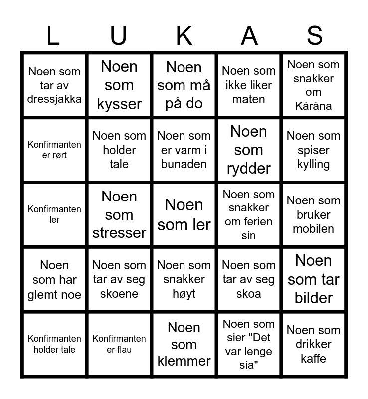 This bingo card has 35 words: Konfirmanten fikler med noe på bordet, Noen som løper, Noen som er rørt, Noen som holder tale, Noen som snakker høyt, Noen som ikke liker maten, Konfirmanten er rørt, Noen som sier "Tnåååå", Noen som er varm i bunaden, Konfirmanten fikser på håret, Konfirmanten ler, Noen som snakker om Kåråna, Konfirmanten gråter, Noen som søler, Noen som tar av dressjakka, Noen som snakker om ferien sin, Noen som sier "Det var lenge sia", Noen som stresser, Noen som har glemt noe, Noen som ler, Noen som tar av seg skoa, Konfirmanten holder tale, Noen som tar bilder, Konfirmanten er flau, Noen som må på do, Noen som spiser kylling, Noen som drikker kaffe, Noen som spiser melon, Noen som rydder, Noen som bruker mobilen, Noen som synger, Noen som klemmer, Noen som tar av seg skoene, Noen som kysser and Konfirmanten bruker mobilen.