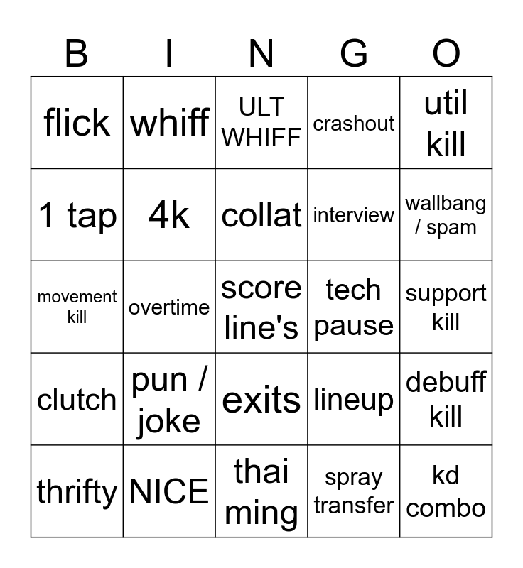 This bingo card has 33 words: kd combo, ace, overtime, flawless, clutch, 4k, util kill, thrifty, whiff, trigger discipline, collat, ULT WHIFF, TAC (FREE), 4-4, tech pause, wallbang / spam, NICE, movement kill, pun / joke, lineup, exits, dying to bomb, flick, support kill, thai ming, score line's, crashout, interview, 1 tap, debuff kill, Nuke, spray transfer and shotgun kill.