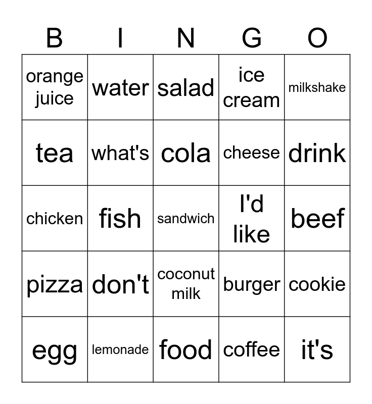 This bingo card has 26 words: coconut milk, coffee, cola, lemonade, milkshake, orange juice, tea, water, beef, burger, cheese, chicken, cookie, egg, fish, fries, ice cream, pizza, salad, sandwich, drink, food, I'd like, don't, what's and it's.