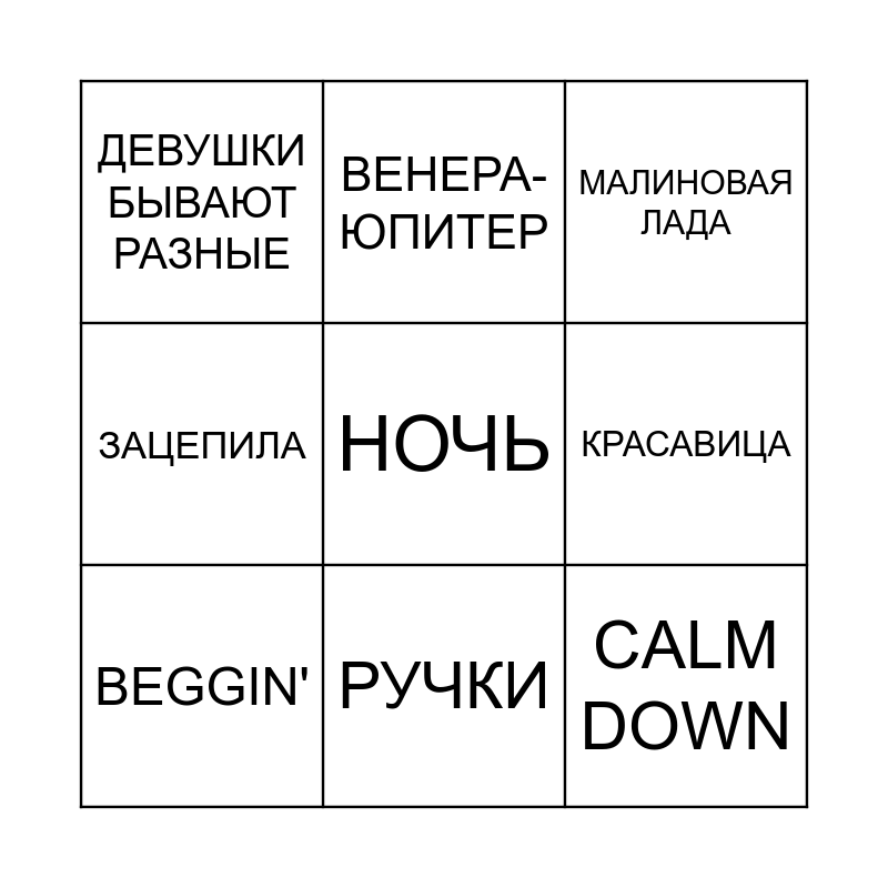 This bingo card has 23 words: ФАНТАЗЁР, ХОЛОСТЯК, РУЧКИ, HOUDINI, НОЧЬ, ДЕВУШКИ БЫВАЮТ РАЗНЫЕ, КРАСАВИЦА, ВЕНЕРА-ЮПИТЕР, ЯСНЫЙ МОЙ СВЕТ, ЛЮБИ МЕНЯ ЛЮБИ, ЖИТЬ В КАЙФ, CALM DOWN, ДО СКОРОЙ ВСТРЕЧИ, ФЕДЕРИКО ФЕЛЛИНИ, Я В МОМЕНТЕ, ЗНАЕШЬ ЛИ ТЫ, МАЛИНОВАЯ ЛАДА, САНСАРА, BEGGIN', ПЧЕЛОВОД, ЗАЦЕПИЛА, ЧТО ТАКОЕ ОСЕНЬ and 18 МНЕ УЖЕ.