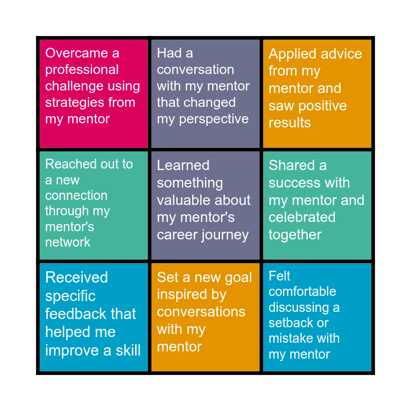 This bingo card has 9 words: Received specific feedback that helped me improve a skill, Applied advice from my mentor and saw positive results, Had a conversation with my mentor that changed my perspective, Reached out to a new connection through my mentor's network, Overcame a professional challenge using strategies from my mentor, Shared a success with my mentor and celebrated together, Learned something valuable about my mentor's career journey, Felt comfortable discussing a setback or mistake with my mentor and Set a new goal inspired by conversations with my mentor.