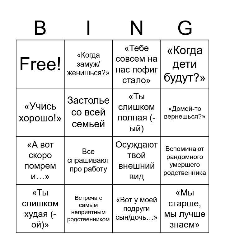 This bingo card has 16 words: «Ты слишком худая (-ой)», Встреча с самым неприятным родственником, «Тебе совсем на нас пофиг стало», «Когда дети будут?», «Учись хорошо!», «Когда замуж/женишься?», Осуждают твой внешний вид, Вспоминают рандомного умершего родственника, Free!, Застолье со всей семьей, «Вот у моей подруги сын/дочь…», «Домой-то вернешься?», «А вот скоро помрем и…», Все спрашивают про работу, «Ты слишком полная (-ый) and «Мы старше, мы лучше знаем».