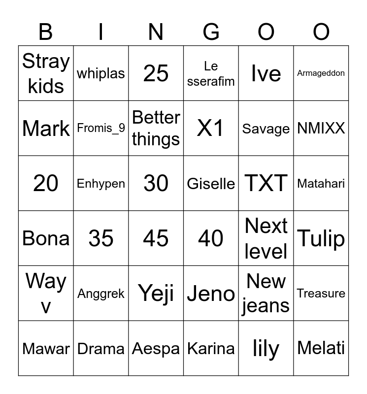 This bingo card has 36 words: Jeno, Yeji, Karina, Mark, Bona, Giselle, Fromis_9, Aespa, Ive, New jeans, NMIXX, Le sserafim, Treasure, Enhypen, X1, Stray kids, Way v, TXT, 20, 25, 30, 35, 40, 45, Next level, whiplas, Savage, Drama, Better things, Armageddon, Melati, Mawar, Tulip, Matahari, Anggrek and lily.