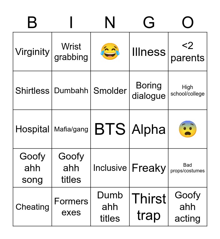 This bingo card has a free space and 24 words: Goofy ahh titles, Formers exes, Smolder, Cheating, <2 parents, Virginity, Shirtless, Wrist grabbing, Alpha, Inclusive, Boring dialogue, Hospital, Freaky, Bad props/costumes, Dumbahh, Thirst trap, 😨, 😂, High school/college, Mafia/gang, Goofy ahh acting, Goofy ahh song, Illness and Dumb ahh titles.