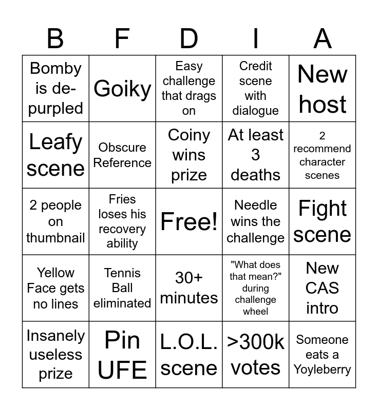 This bingo card has a free space and 24 words: Tennis Ball eliminated, Pin UFE, Coiny wins prize, Insanely useless prize, New host, Bomby is de-purpled, Leafy scene, Goiky, Needle wins the challenge, 30+ minutes, At least 3 deaths, 2 people on thumbnail, "What does that mean?" during challenge wheel, New CAS intro, Obscure Reference, >300k votes, Fight scene, Easy challenge that drags on, 2 recommend character scenes, Fries loses his recovery ability, Someone eats a Yoyleberry, Yellow Face gets no lines, Credit scene with dialogue and L.O.L. scene.