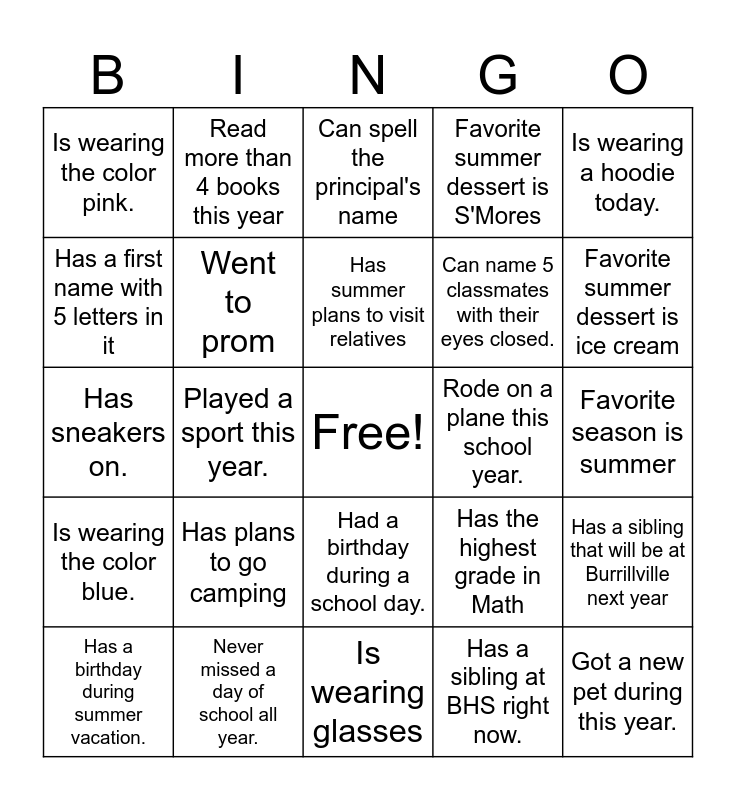 This bingo card has a free space and 24 words: Has plans to go camping, Never missed a day of school all year., Has summer plans to visit relatives, Has a birthday during summer vacation., Is wearing a hoodie today., Is wearing the color pink., Has a first name with 5 letters in it, Read more than 4 books this year, Rode on a plane this school year., Had a birthday during a school day., Can name 5 classmates with their eyes closed., Has sneakers on., Has the highest grade in Math, Has a sibling that will be at Burrillville next year, Went to prom, Has a sibling at BHS right now., Favorite season is summer, Can spell the principal's name, Favorite summer dessert is ice cream, Played a sport this year., Got a new pet during this year., Is wearing the color blue., Favorite summer dessert is S'Mores and Is wearing glasses.