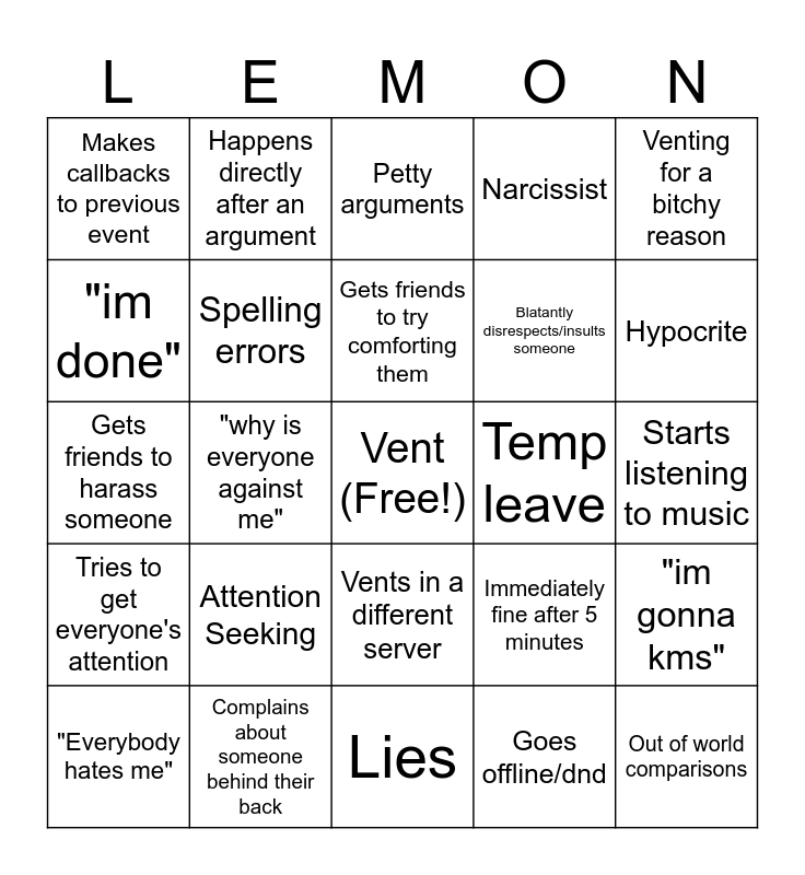 This bingo card has a free space and 24 words: Attention Seeking, Complains about someone behind their back, Gets friends to try comforting them, "Everybody hates me", Venting for a bitchy reason, Makes callbacks to previous event, "im done", Happens directly after an argument, Temp leave, Vents in a different server, Blatantly disrespects/insults someone, Gets friends to harass someone, Immediately fine after 5 minutes, "im gonna kms", Spelling errors, Goes offline/dnd, Starts listening to music, Petty arguments, Hypocrite, "why is everyone against me", Out of world comparisons, Tries to get everyone's attention, Narcissist and Lies.