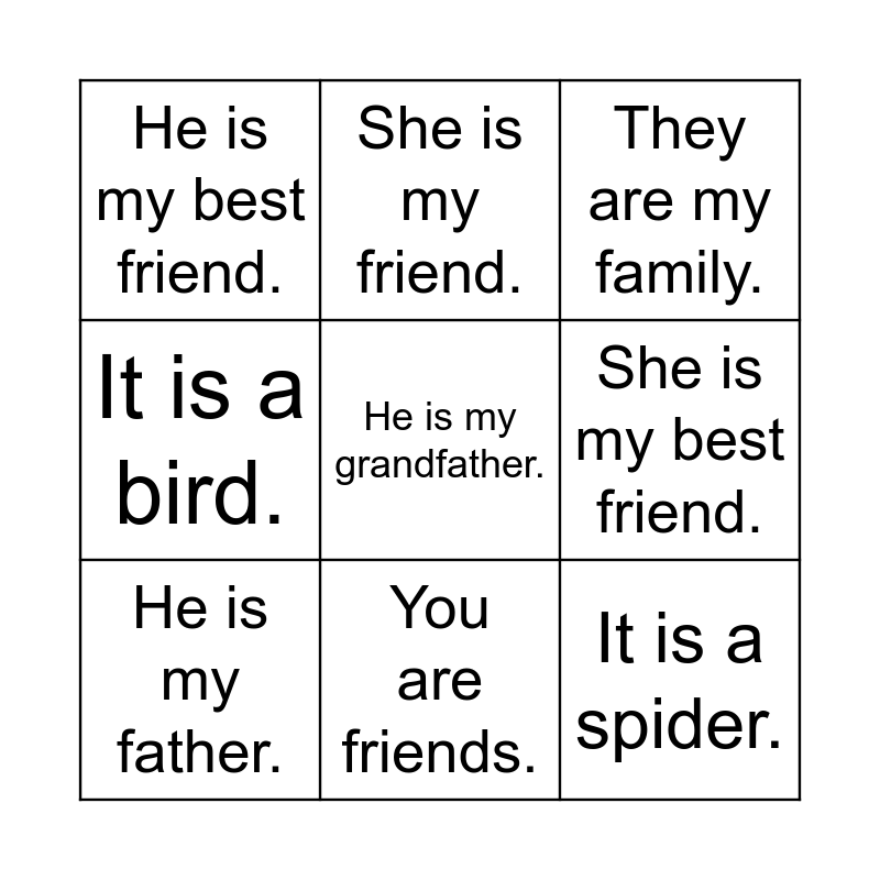 This bingo card has 32 words: I am a student., I am a teacher., You are cool., She is cool., She is my mother., He is my father., He is my grandfather., He is my friend., She is my friend., We are friends., You are friends., They are my family., We are classmate., She is my classmate., He is my classmate., He is a superhero., You are spiderman., He is spiderman., He is Messi., She is nice., He is nice., She is Shakira., It is a banana., It is a cat., It is a dog., It is a bird., It is a spider., She is my best friend., He is my best friend., I am a superhero., She is a superhero. and He is a superhero..