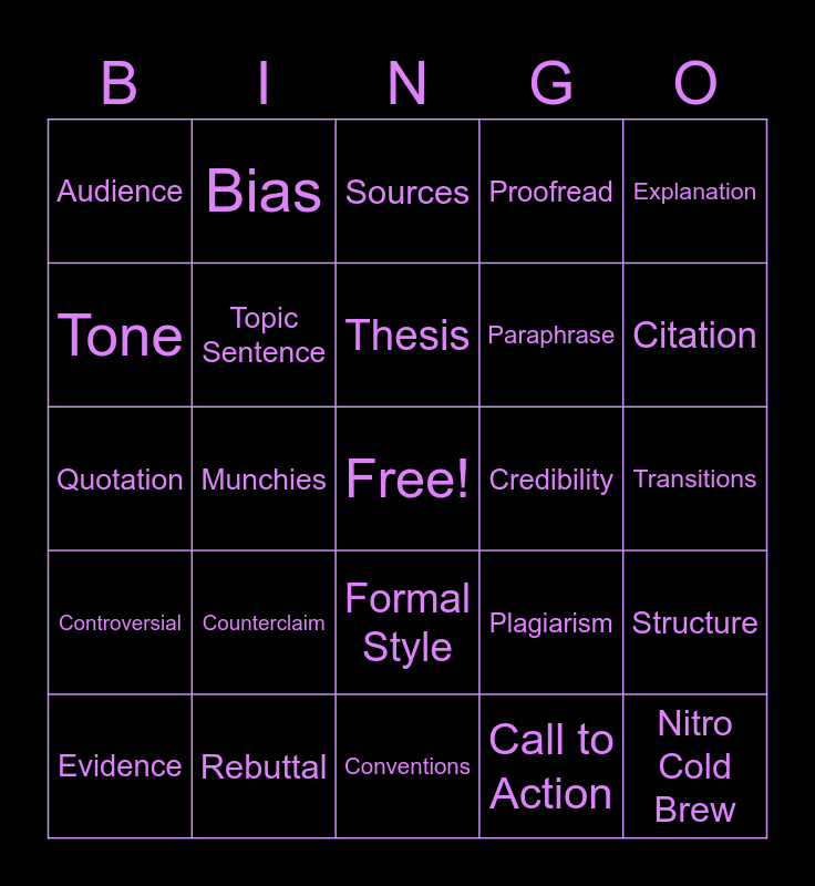This bingo card has a free space and 24 words: Counterclaim, Rebuttal, Thesis, Evidence, Explanation, Audience, Tone, Bias, Credibility, Formal Style, Paraphrase, Quotation, Plagiarism, Structure, Topic Sentence, Call to Action, Transitions, Sources, Citation, Munchies, Nitro Cold Brew, Controversial, Proofread and Conventions.
