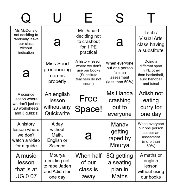 This bingo card has a free space and 29 words: Miss Sood not moving people from their seats, Mourya deciding not to rape Jaden and Adish for one day, Mr Donald deciding not to crashout for 1 PE practical, People not going to our class during English Class, Tech / Visual Arts class having a substitute, Ms McDonald not deciding to randomly leave our class without indication, Miss Sood pronouncing names properly, A history lesson where we don't use our books (Substitute teachers do not count), Ms Handa crashing out to everyone, When everyone but one person passes an assesment (more than 80%), A music lesson that is at UG 0.07, An english lesson without any Quickwrite, 8Q getting a seating plan in Maths, A maths or english lesson without using our books, A science lesson where we don't just do 20 worksheets and 3 quizziz, A day where we get minimal supervision, When half of our class is away, Manav getting raped by Mourya, Doing a different sport in PE other than basketball, euro handball and futsal, A history lesson where we don't watch a video for a guide, A day without Math, English or Science, A tech / visual arts lesson being skipped, When everyone but one person fails an assesment (less than 50%), Adish not eating curry for one day, a, a, a, a and a.