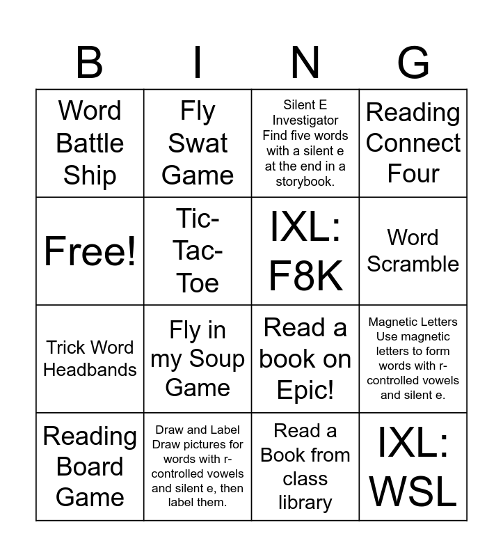 This bingo card has 16 words: Draw and Label Draw pictures for words with r-controlled vowels and silent e, then label them., Magnetic Letters Use magnetic letters to form words with r-controlled vowels and silent e., Silent E Investigator Find five words with a silent e at the end in a storybook., Word Battle Ship, Trick Word Headbands, Fly Swat Game, Read a book on Epic!, Read a Book from class library, Free!, Tic-Tac-Toe, Reading Board Game, Reading Connect Four, Fly in my Soup Game, Word Scramble, IXL: F8K and IXL: WSL.