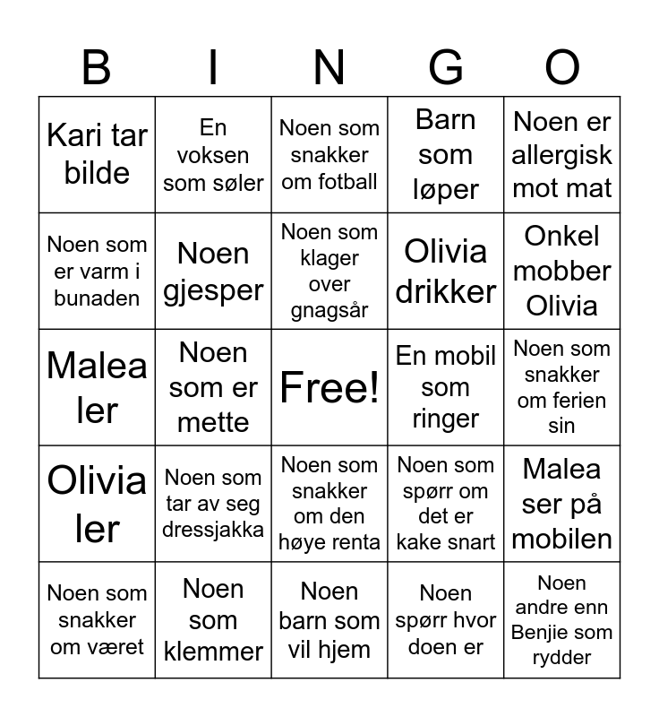 This bingo card has a free space and 35 words: Noen som snakker om ferien sin, Noen som har glemt noe, Noen sier maten var god, Noen gjesper, Noen som snakker om den høye renta, Barn som løper, Noen som er varm i bunaden, Nown som nyser, Noen som klager over gnagsår, Olivia blir flau, Malea ler, Noen er allergisk mot mat, Benjie rydder i buffeten, Noen som hoster, Kari tar bilde, En mobil som ringer, Noen spørr hvor doen er, Noen som er mette, Olivia ler, Noen andre enn Benjie som rydder, Noen som spørr om det er kake snart, Noen som snakker om været, Malea ser på mobilen, Noen som klemmer, Noen som snakker om fotball, Onkel mobber Olivia, Noen som tar av seg skoene, Noen klager på Trump, Olivia drikker, Noen som snakker om ferien sin, Noen holder tale, Noen barn som vil hjem, Noen som tar av seg dressjakka, En voksen som søler and Mathias.