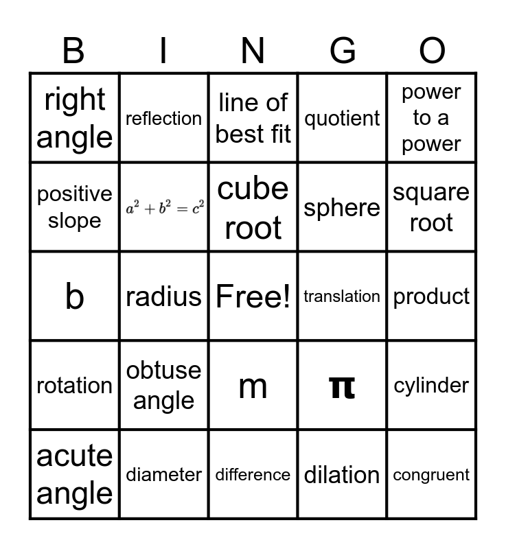 This bingo card has 1 images, a free space and 27 words: cylinder, cone, sphere, dilation, positive slope, line of best fit, reflection, rotation, translation, acute angle, b, quotient, diameter, difference, square root, negative slope, obtuse angle, cube root, m, right angle, straight angle, congruent, radius, product, 𝝿, power to a power and sum.