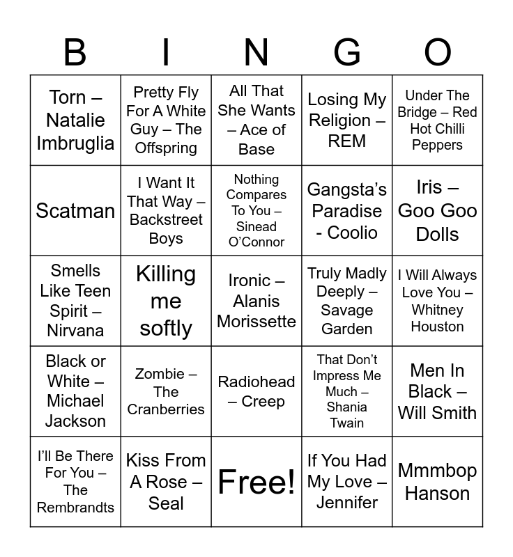 This bingo card has 25 words: Black or White – Michael Jackson, Kiss From A Rose – Seal, Ironic – Alanis Morissette, If You Had My Love – Jennifer, Under The Bridge – Red Hot Chilli Peppers, Torn – Natalie Imbruglia, Pretty Fly For A White Guy – The Offspring, All That She Wants – Ace of Base, Truly Madly Deeply – Savage Garden, Men In Black – Will Smith, Scatman, I Want It That Way – Backstreet Boys, Free!, That Don’t Impress Me Much – Shania Twain, Iris – Goo Goo Dolls, I’ll Be There For You – The Rembrandts, Killing me softly, Nothing Compares To You – Sinead O’Connor, Gangsta’s Paradise - Coolio, I Will Always Love You – Whitney Houston, Smells Like Teen Spirit – Nirvana, Zombie – The Cranberries, Radiohead – Creep, Losing My Religion – REM and Mmmbop Hanson.