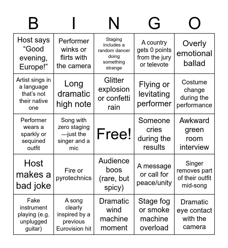 This bingo card has a free space and 25 words: Fire or pyrotechnics, Dramatic wind machine moment, Glitter explosion or confetti rain, Fake instrument playing (e.g. unplugged guitar), Overly emotional ballad, Host says “Good evening, Europe!”, Artist sings in a language that’s not their native one, Performer winks or flirts with the camera, Someone cries during the results, Audience boos (rare, but spicy), Flying or levitating performer, Performer wears a sparkly or sequined outfit, A message or call for peace/unity, Singer removes part of their outfit mid-song, Long dramatic high note, Country gives 12 points to a neighbor, Awkward green room interview, Staging includes a random dancer doing something strange, Costume change during the performance, Song with zero staging—just the singer and a mic, Dramatic eye contact with the camera, A song clearly inspired by a previous Eurovision hit, Host makes a bad joke, A country gets 0 points from the jury or televote and Stage fog or smoke machine overload.