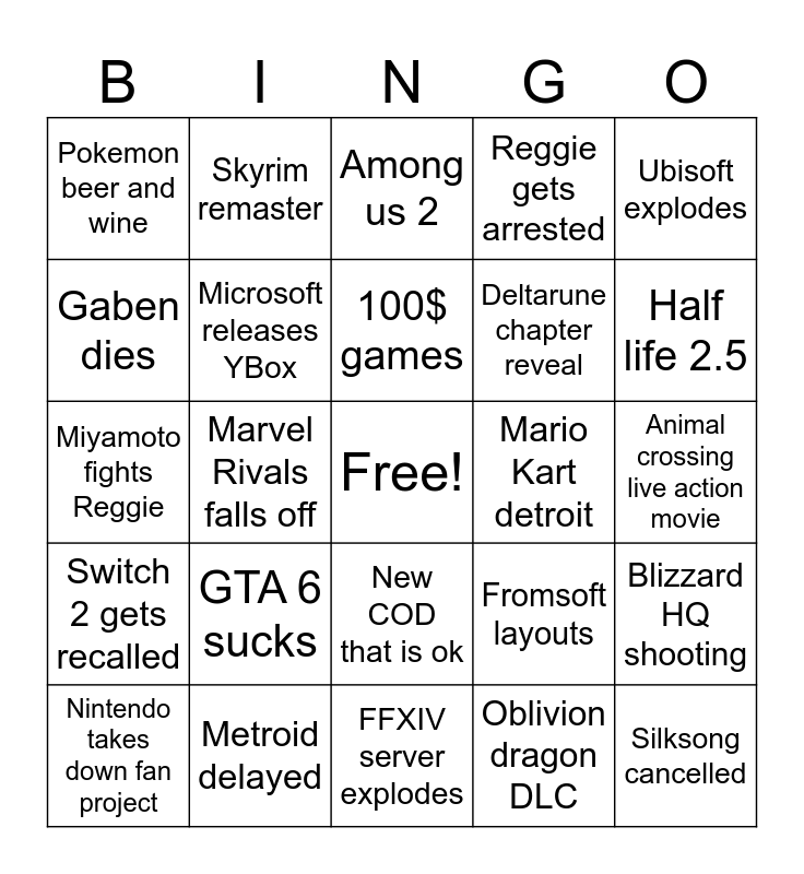 This bingo card has a free space and 24 words: GTA 6 sucks, Metroid delayed, 100$ games, Nintendo takes down fan project, Ubisoft explodes, Pokemon beer and wine, Gaben dies, Skyrim remaster, Mario Kart detroit, New COD that is ok, Deltarune chapter reveal, Miyamoto fights Reggie, Fromsoft layouts, Blizzard HQ shooting, Microsoft releases YBox, Oblivion dragon DLC, Animal crossing live action movie, Among us 2, Half life 2.5, Marvel Rivals falls off, Silksong cancelled, Switch 2 gets recalled, Reggie gets arrested and FFXIV server explodes.