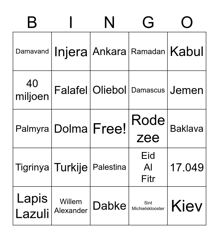 This bingo card has a free space and 34 words: Stamppot, Sint Michielsklooster, Eufraat, Binnenhof, Tigrinya, Falafel, Kabul, Lapis Lazuli, Injera, Sanaa, Oliebol, Ankara, Selam, Kerst boom, Rode zee, Jemen, Willem Alexander, Palmyra, Turkije, Eid Al Fitr, Palestina, 23 miljoen, Damavand, Baklava, Dabke, Kiev, Ramadan, Teheran, Damascus, 40 miljoen, Borsjtsj, Dolma, 17.049 and 120.