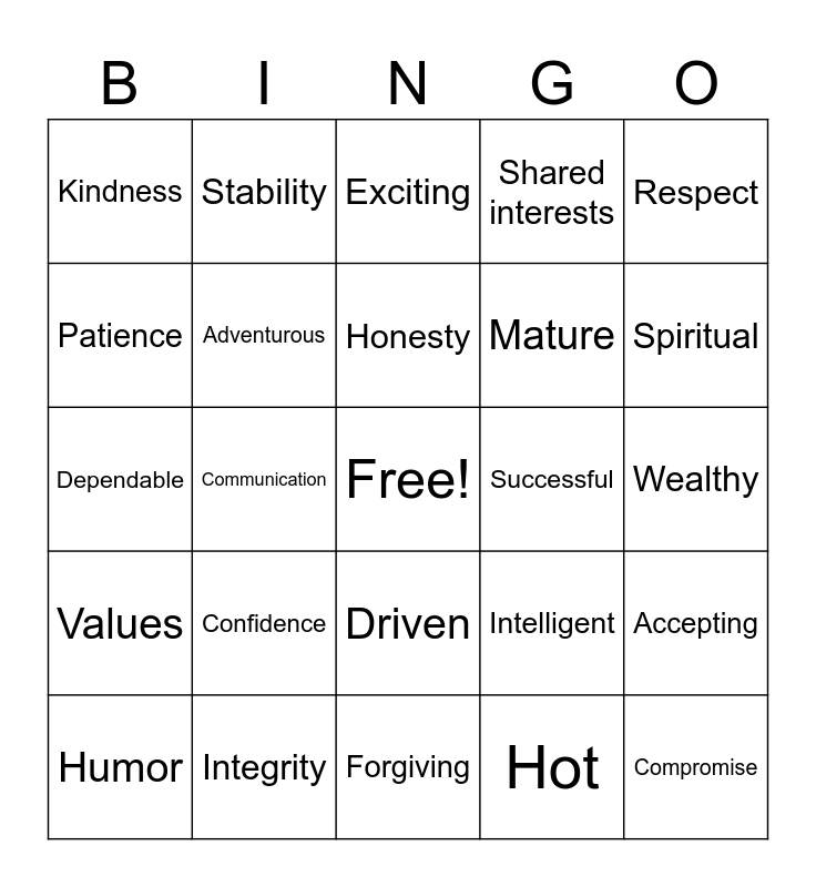 This bingo card has a free space and 24 words: Confidence, Integrity, Honesty, Humor, Respect, Kindness, Patience, Stability, Successful, Driven, Mature, Dependable, Intelligent, Accepting, Adventurous, Hot, Wealthy, Exciting, Spiritual, Communication, Compromise, Values, Shared interests and Forgiving.