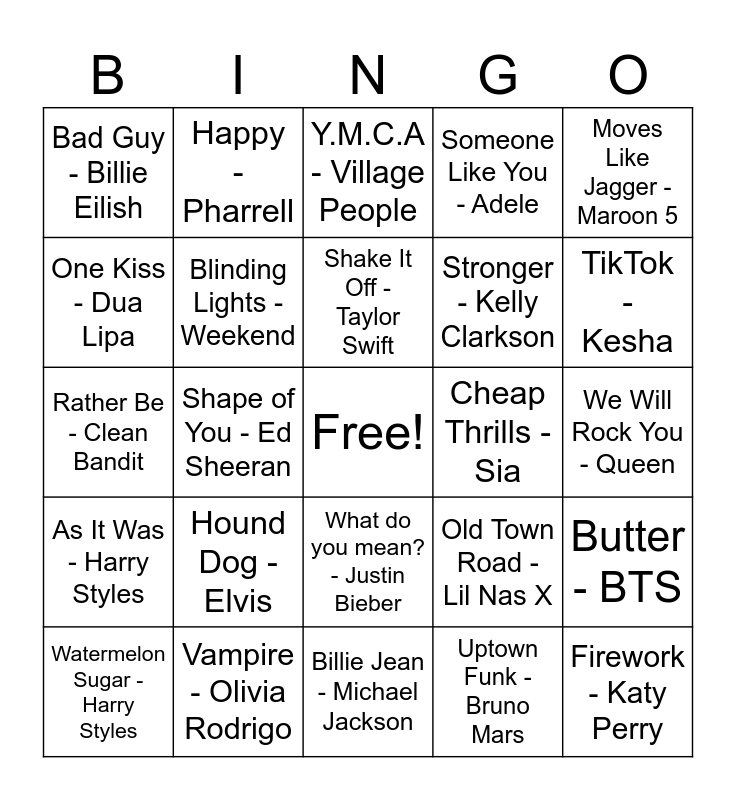 This bingo card has a free space and 24 words: Hound Dog - Elvis, Vampire - Olivia Rodrigo, Shake It Off - Taylor Swift, Watermelon Sugar - Harry Styles, Moves Like Jagger - Maroon 5, Bad Guy - Billie Eilish, One Kiss - Dua Lipa, Happy - Pharrell, Cheap Thrills - Sia, What do you mean? - Justin Bieber, Stronger - Kelly Clarkson, Rather Be - Clean Bandit, Old Town Road - Lil Nas X, Butter - BTS, Blinding Lights - Weekend, Uptown Funk - Bruno Mars, We Will Rock You - Queen, Y.M.C.A - Village People, TikTok - Kesha, Shape of You - Ed Sheeran, Firework - Katy Perry, As It Was - Harry Styles, Someone Like You - Adele and Billie Jean - Michael Jackson.