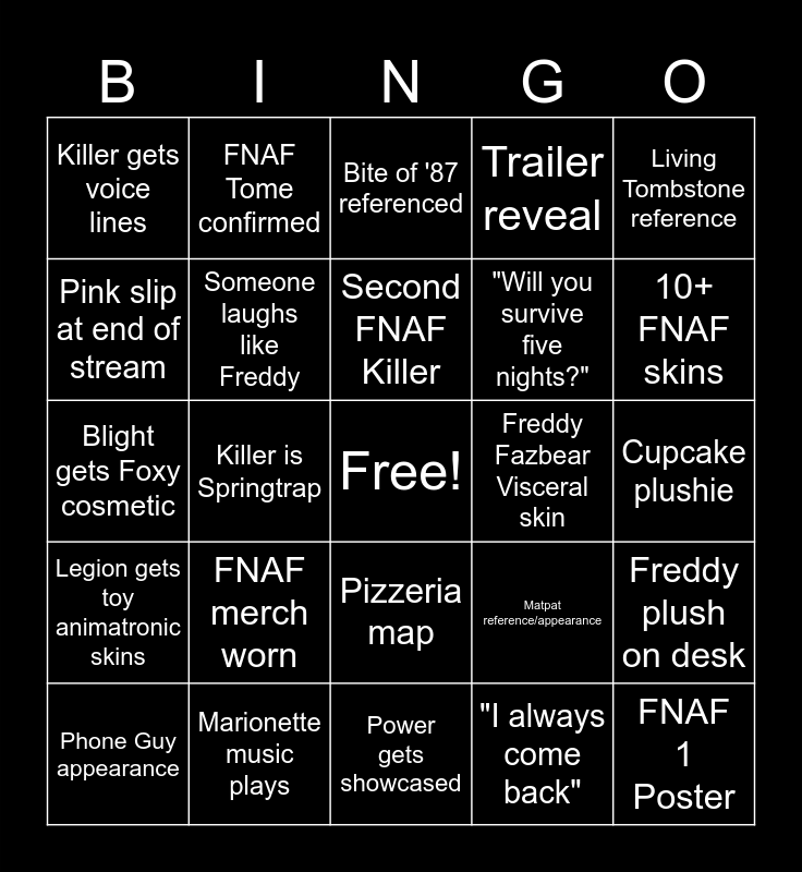 This bingo card has a free space and 32 words: "I always come back", Balloon Boy featured, Killer is Springtrap, "Are you ready for Freddy?", Legion gets toy animatronic skins, Someone laughs like Freddy, Living Tombstone reference, Freddy plush on desk, FNAF Tome confirmed, Michael Afton survivor, Second FNAF Killer, Bite of '87 referenced, Golden Freddy jumpscare, "It's Me", Freddy Fazbear Visceral skin, Mori shown, Phone Guy appearance, Blight gets Foxy cosmetic, Pizzeria map, FNAF merch worn, Matpat reference/appearance, Pizza box visible, Cupcake plushie, Marionette music plays, FNAF 1 Poster, Trailer reveal, "Will you survive five nights?", Pink slip at end of stream, Killer gets voice lines, Power gets showcased, Perks revealed and 10+ FNAF skins.