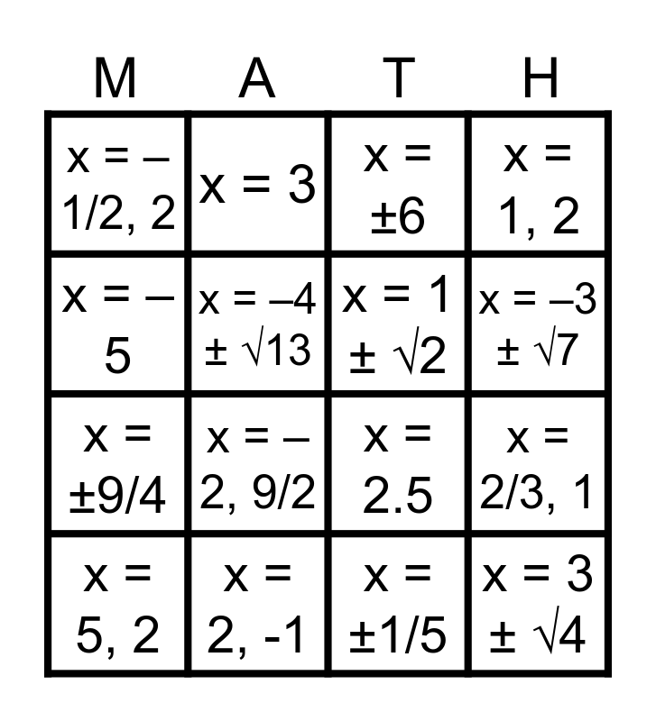 This bingo card has 16 words: x = 2, -1, x = 2/3, 1, x = ±6, x = –1/2, 2, x = ±9/4, x = 3, x = 2.5, x = ±1/5, x = –5, x = –4 ± √13, x = 5, 2, x = 1, 2, x = –2, 9/2, x = –3 ± √7, x = 1 ± √2 and x = 3 ± √4.