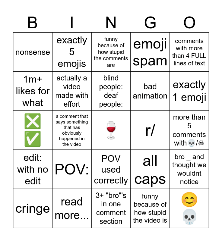 This bingo card has 45 words: πΏ, π·, bot comment, cringe, actually funny, funny because of how stupid the video is, funny because of how stupid the comments are, bro really said, comments with more than 4 FULL lines of text, read more..., emoji spam, r/, POV used correctly, POV:, truly a _ moment, 3+ "bro"'s in one comment section, β, β β , exactly 3 emojis, exactly 1 emoji, exactly 5 emojis, template comments, before GTA 6, nonsense, arabic nonsense, more than 5 comments withπ/β , π’ spam, mom im famous, all caps, edit: with no edit, bro really thought _, bro _ and thought we wouldnt notice, that _ was personal, β€, _ got me dying, a comment that says something that has obviously happened in the video, as a _,..., bro really said _, π π, blind people: deaf people:, 1m+ likes for what, bad animation, learning colors, actually a video made with effort and football.