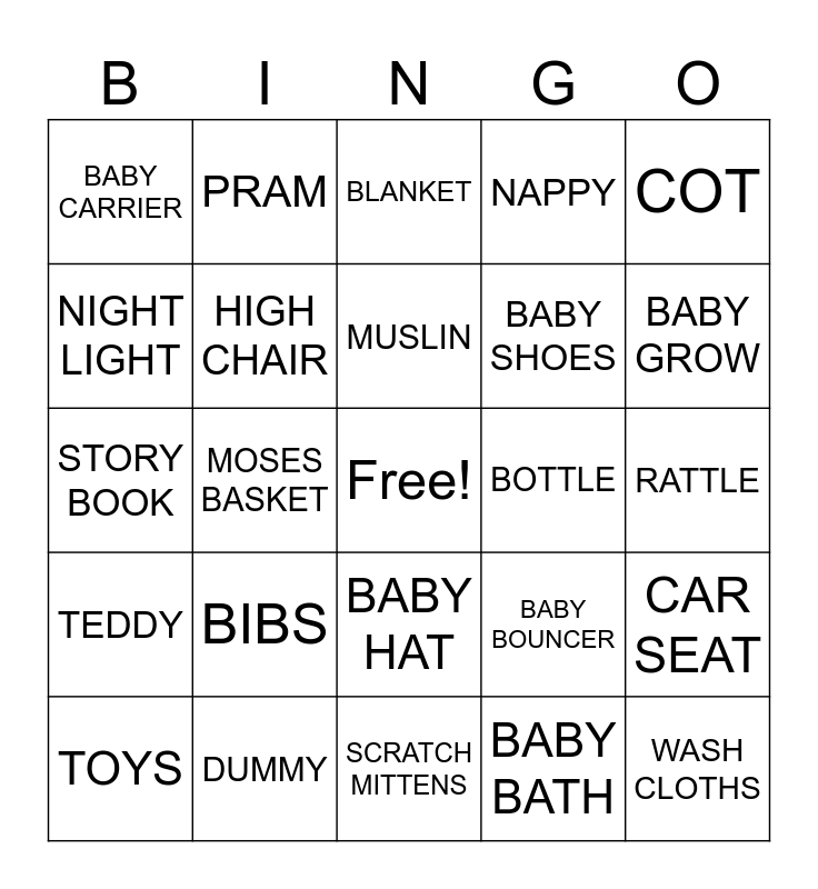 This bingo card has a free space and 24 words: BIBS, DUMMY, MUSLIN, TOYS, COT, BABY CARRIER, NIGHT LIGHT, PRAM, BOTTLE, BABY HAT, BABY SHOES, STORY BOOK, BABY BOUNCER, CAR SEAT, HIGH CHAIR, BABY BATH, RATTLE, BLANKET, BABY GROW, MOSES BASKET, WASH CLOTHS, TEDDY, NAPPY and SCRATCH MITTENS.