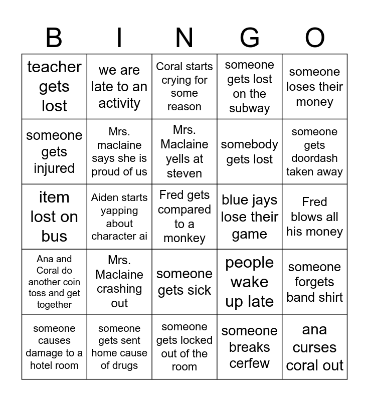 This bingo card has a free space and 24 words: Mrs. Maclaine crashing out, someone gets sent home cause of drugs, Mrs. Maclaine yells at steven, someone causes damage to a hotel room, someone loses their money, teacher gets lost, someone gets injured, we are late to an activity, blue jays lose their game, someone gets sick, somebody gets lost, item lost on bus, people wake up late, someone forgets band shirt, Mrs. maclaine says she is proud of us, someone breaks cerfew, Fred blows all his money, Coral starts crying for some reason, someone gets doordash taken away, Aiden starts yapping about character ai, ana curses coral out, Ana and Coral do another coin toss and get together, someone gets lost on the subway and someone gets locked out of the room.