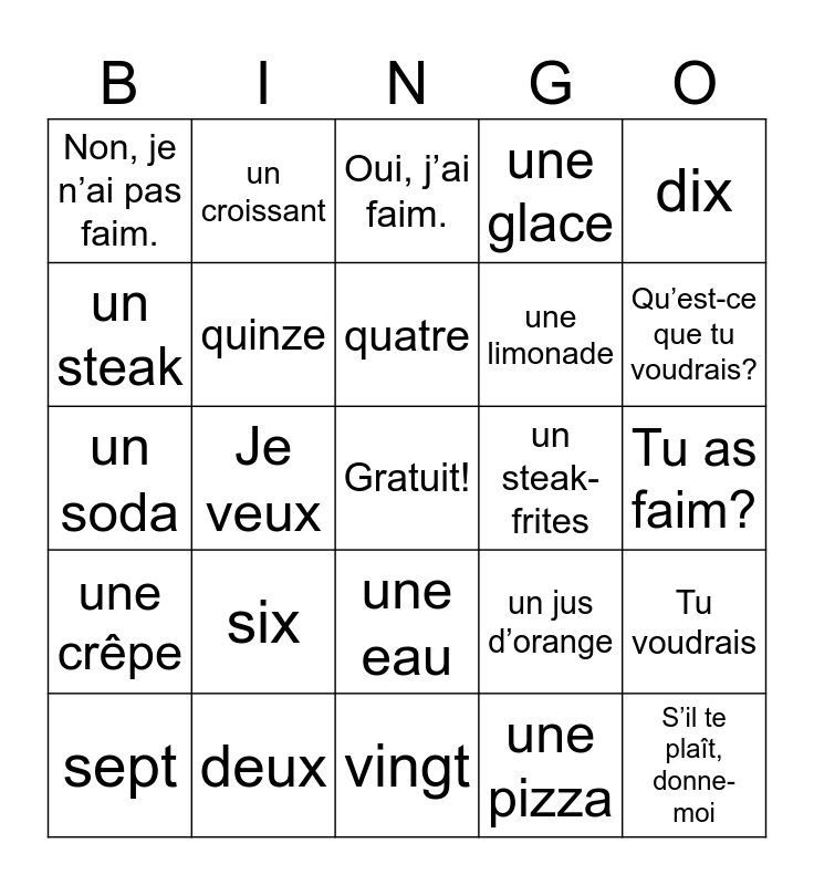 This bingo card has a free space and 24 words: six, deux, quatre, sept, dix, Non, je n’ai pas faim., un steak, un croissant, un steak-frites, une eau, une limonade, un soda, un jus d’orange, Tu voudrais, quinze, une pizza, Tu as faim?, Oui, j’ai faim., Qu’est-ce que tu voudrais?, Je veux, S’il te plaît, donne-moi, une crêpe, une glace and vingt.