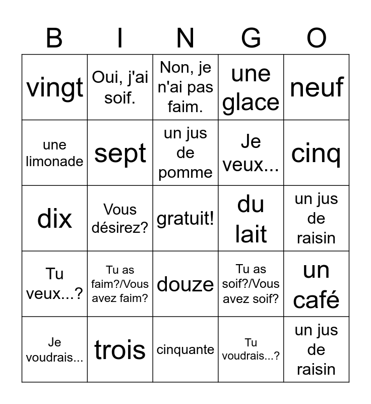 This bingo card has a free space and 24 words: Tu as faim?/Vous avez faim?, trois, un jus de pomme, Je voudrais..., neuf, vingt, une limonade, Oui, j'ai soif., du lait, douze, Je veux..., dix, Tu as soif?/Vous avez soif?, un café, sept, Tu voudrais...?, un jus de raisin, Non, je n'ai pas faim., cinq, Vous désirez?, un jus de raisin, Tu veux...?, une glace and cinquante.